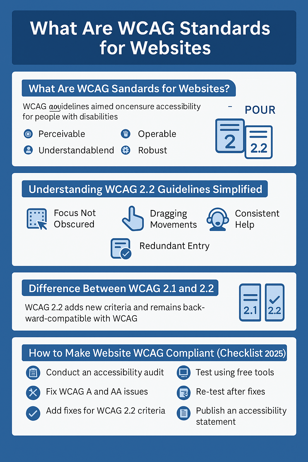 So there you have it—a friendly, streamlined guide answering “what are WCAG standards for websites,” simplifying WCAG 2.2 guidelines, walking you through WCAG compliance checklist 2025, and pointing to free WCAG testing tools for websites. In my opinion it’s smart to tackle accessibility early—even small wins help users and protect your site.